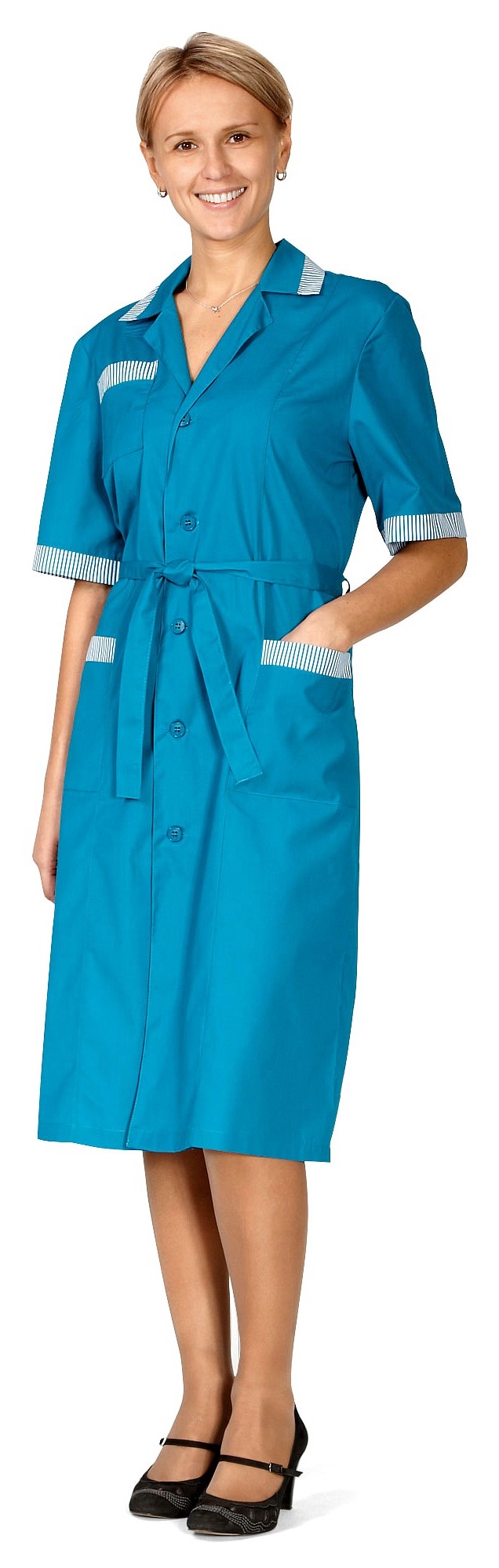 Халат с коротким рукавом, с центральной застежкой на пуговицы, с поясом и накладными карманами