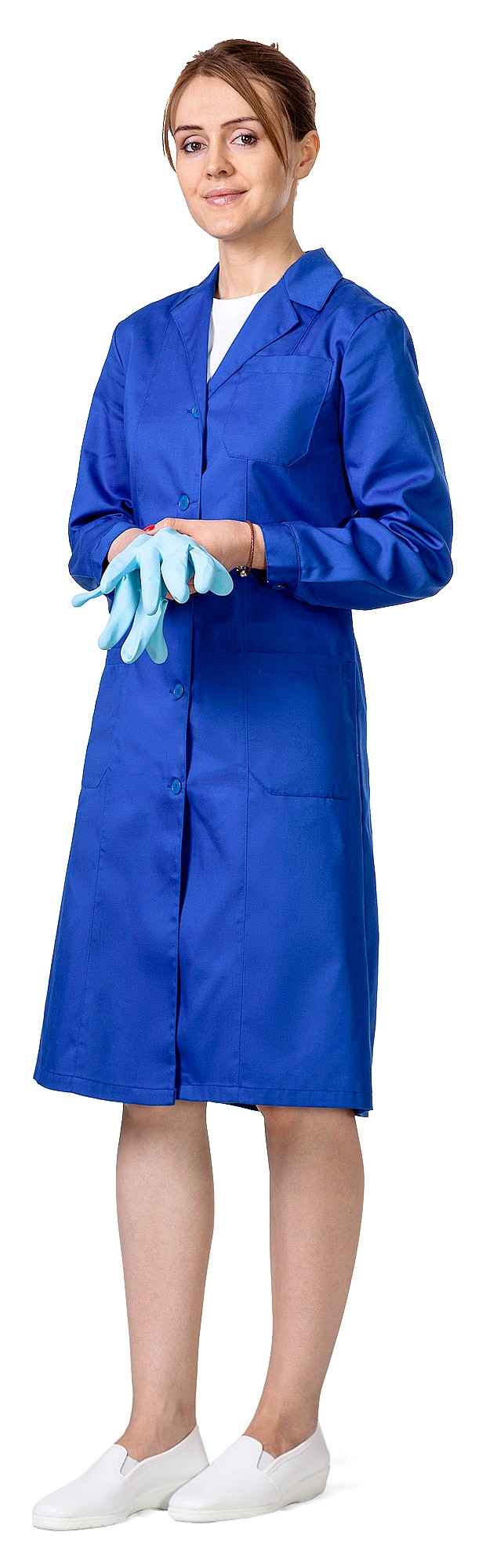 Халат с длинным рукавом, с центральной застежкой на пуговицы, с поясом и накладными карманами