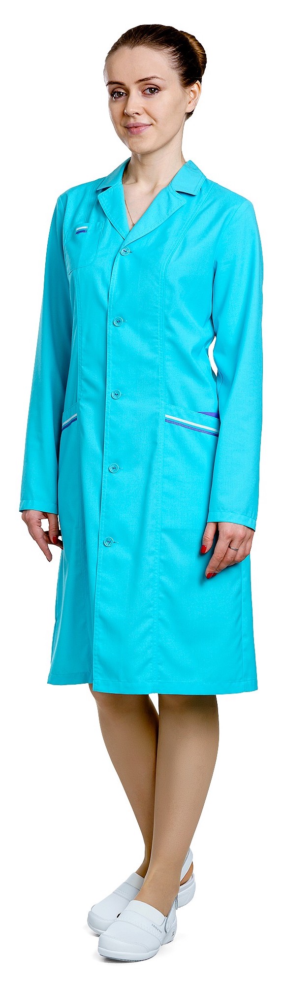 Халат с длинным рукавом, с центральной застежкой на пуговицы, с поясом и накладными карманами