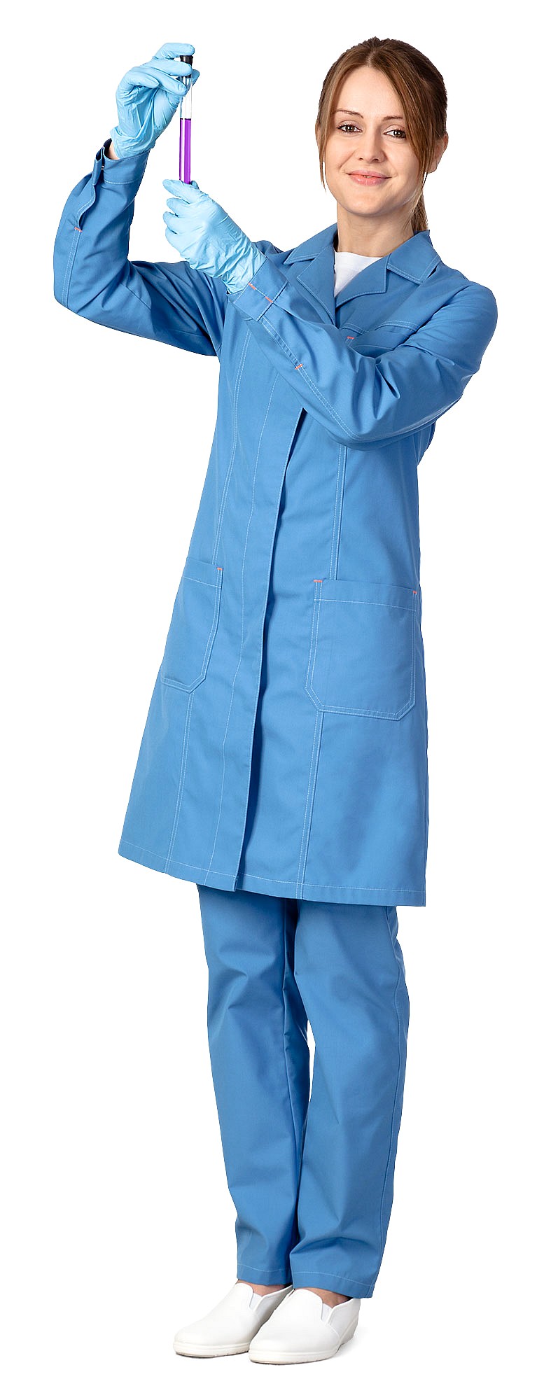 Халат с длинным рукавом, с центральной застежкой на пуговицы, с поясом и накладными карманами